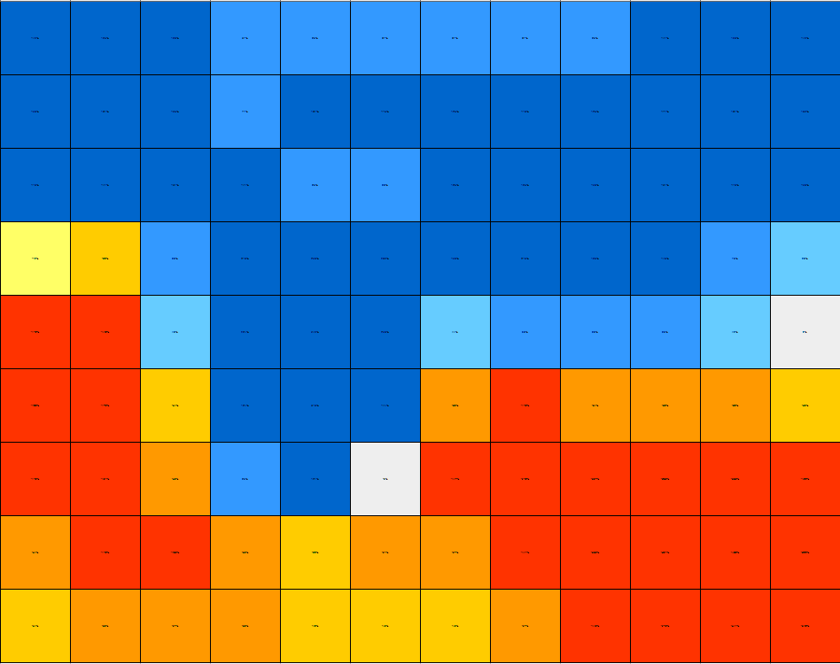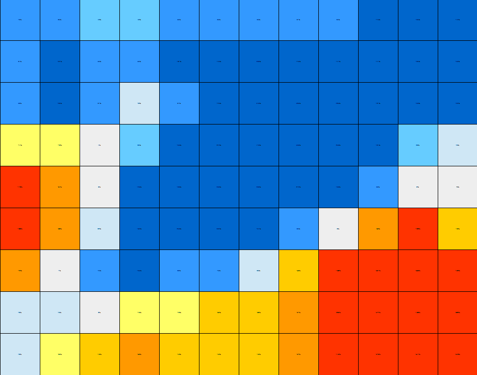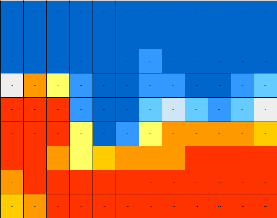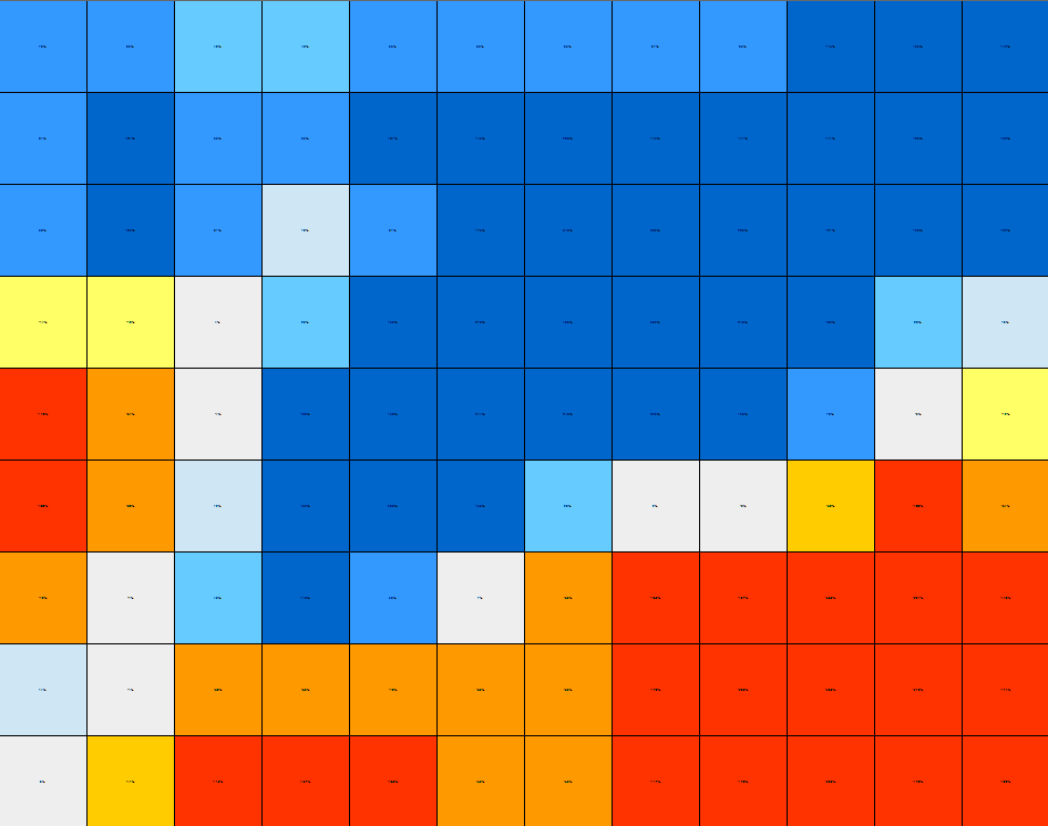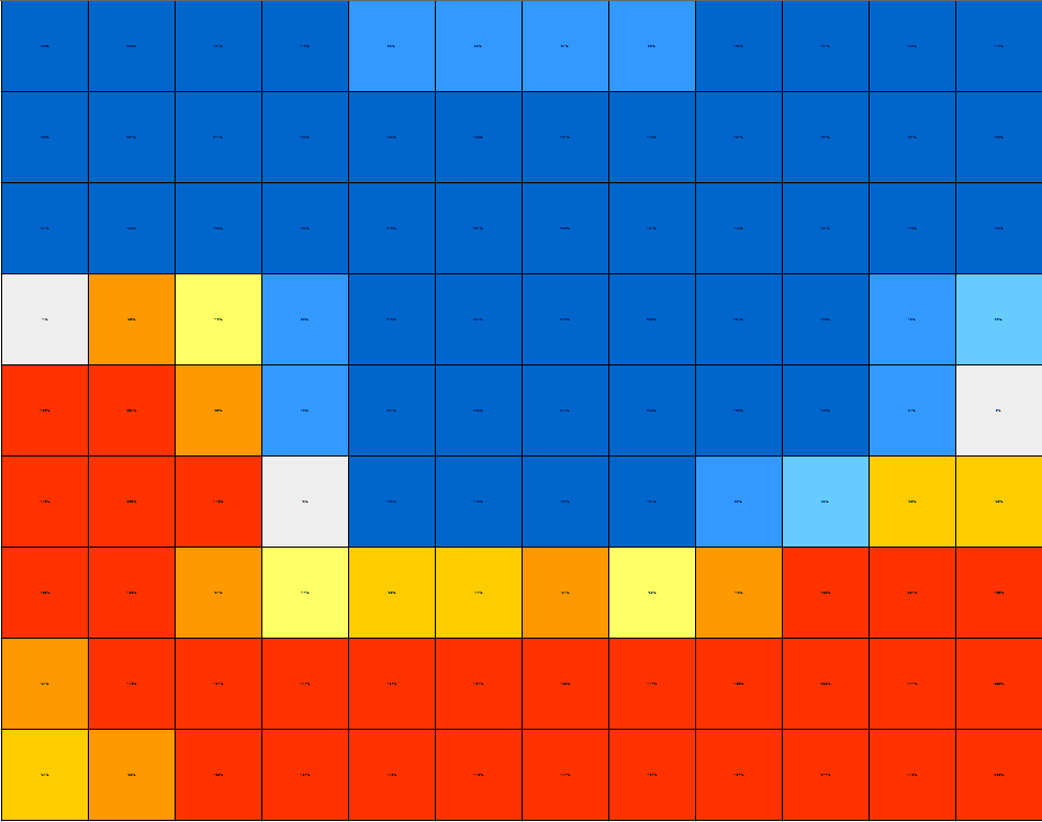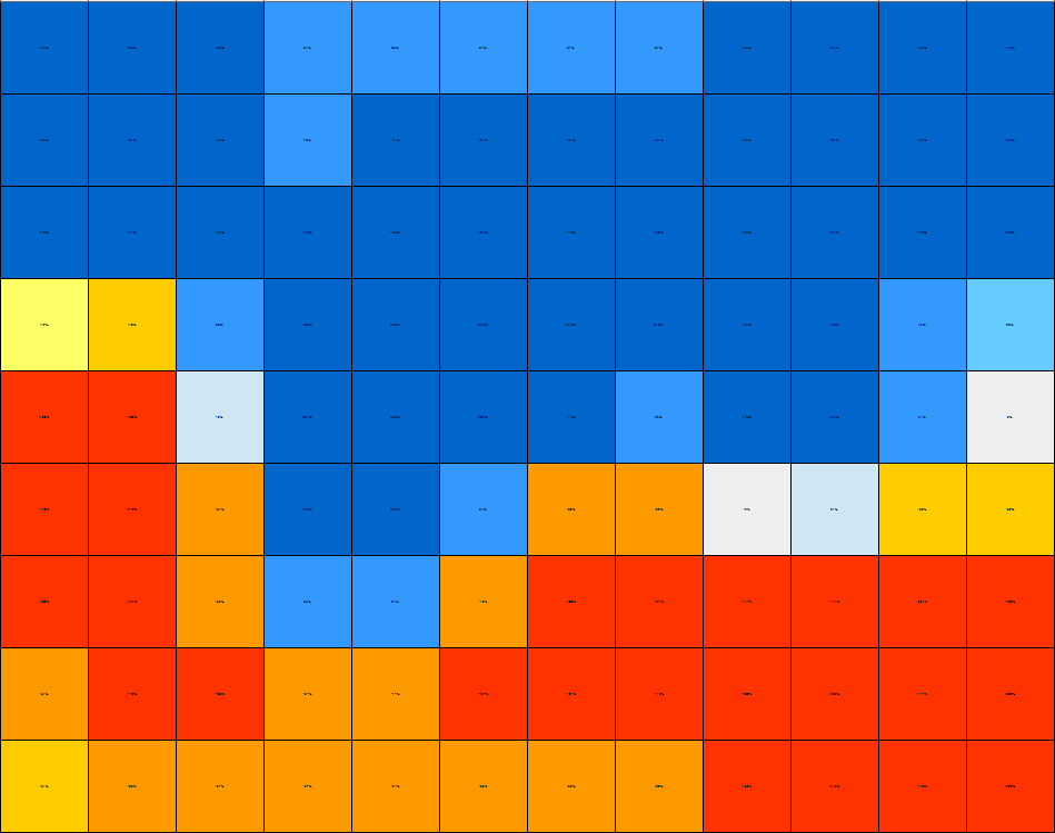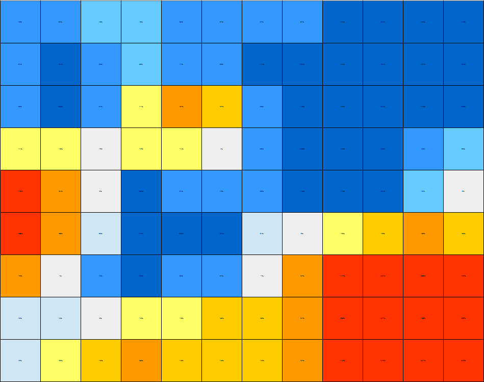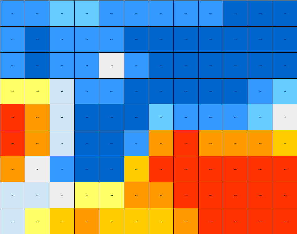 Simulation d’une tentative de mouvement enveloppant (camp rouge – temps 1), avec réaction bleue et tentative de « découpage » (temps 3, 4, 5) et finissant sur un renforcement défensif rouge (temps 7 et 8). Modélisation avec « Avance 0.98 ».